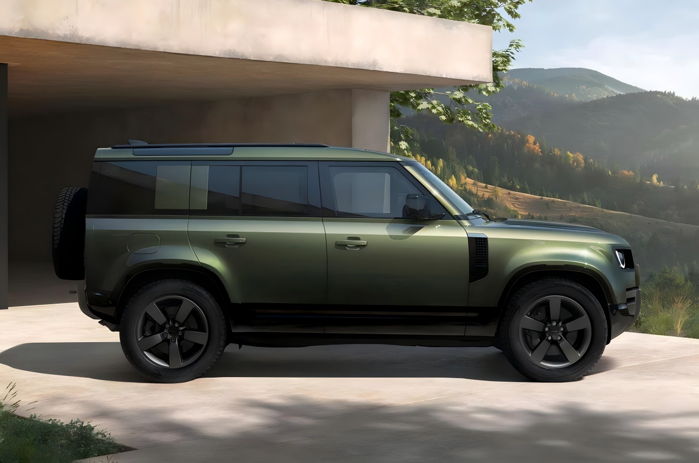 Taobh. Amharc ón taobh, leanann an fheithicil nua ar aghaidh le styling clasaiceach an Land Rover Defender. Glacann an leagan 110 le dearadh ceithre-doras, ina bhfuil fenders taobh tosaigh agus cúil leathan, mar aon le rothaí cúig labhartha agus calipers coscáin il-piston. Fanann toisí an choirp gan athrú, le fad, leithead, agus airde 5018/2105/1967 mm faoi seach, agus rothfhad 3022 mm.