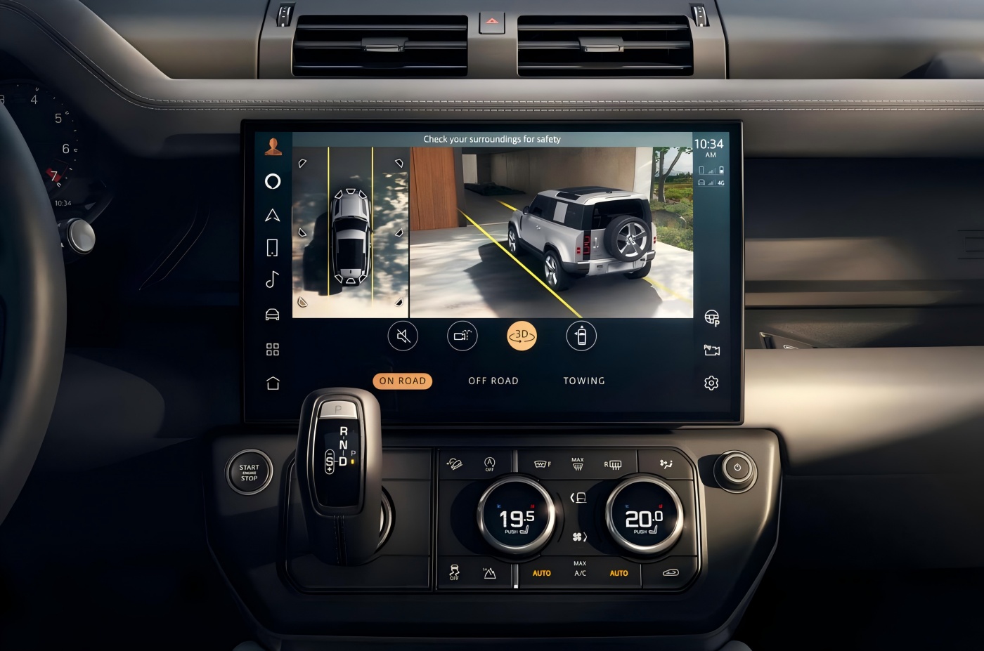 Taobh istigh. Maidir leis an taobh istigh, níl athrú mór tagtha ar leagan amach foriomlán na feithicle nua. Tagann sé fós le painéal ionstraime criostail leachtach iomlán agus le roth stiúrtha ilfheidhmeach trí labhartha. Rinneadh an scáileán taispeána ilmheán i lár an chonsóil ionaid a uasghrádú ó 11.4 orlach go 13.1 orlach. Idir an dá linn, chuir an fheithicil nua córas monatóireachta tiománaithe leis. Comhlíonann an córas monatóireachta seo rialacháin GSR2 an AE. Má bhraitear an tiománaí gan aird a thabhairt ar an mbóthar atá romhainn, spreagfaidh sé aláraim fuaime agus físe. Mar sin féin, is féidir an cúnamh tiománaí a shocrú le díchumasú sna roghanna ar scáileán consóil an ionaid. Ina theannta sin, tá córas rialaithe cúrsála oiriúnaitheach Land Rover á thairiscint den chéad uair ar an gCosantóir Land Rover mar ghné roghnach.